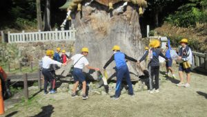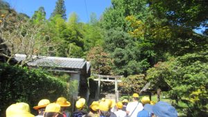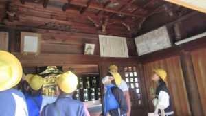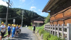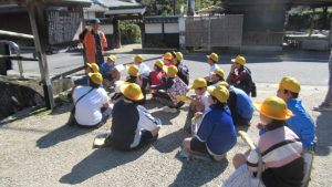 10月23日、校区内大湫の見学に6年生が出かけました。大湫に住んでみえる中山道観光ボランティアガイドさんをお招きして、現地を案内していただきました。中山道琵琶峠の石畳、大湫高札場、観音堂、神明神社の大杉、山車蔵、脇本陣、白山神社の大イチョウ、本陣跡、丸森と、本当に多くの場所に立ち寄り、歴史や建物の特徴など多くのことを話していただきました。3年生の時に見学した場所もありますが、新たな発見に「なるほど」と首を振ったり、メモを取ったり、実際に触れたりして、楽しく見学することができました。神明神社の大杉の大きさには、何度見ても「すごい」「でかい」と感動していました。