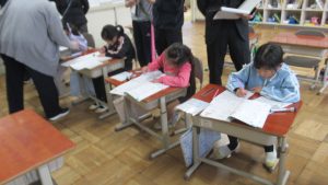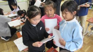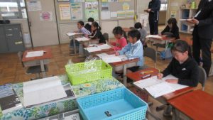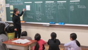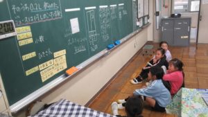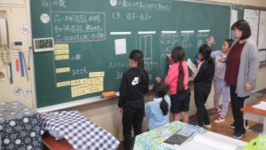 11月13日、3年生の算数「少数」の授業から、先生たちの授業づくりの研修をしました。3年生5人が少数の引き算の仕方を考えました。自分の考えがまとまると交流したり、黒板に書いて説明したりして、5人で計算の仕方を追究しました。「0、5は0、1が5個で、0、3は0、1が3個なので〜」と筋道を立てて話すことができ、どの子も考えを深め、少数の引き算の仕方を身につけました。楽しく仲間と解決していくすてきな授業でした。