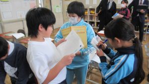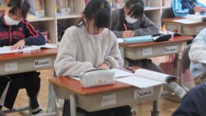 12月3日、4年生の算数の授業を先生方で参観して、算数の授業について研修をしました。4年生の子どもたちは、分数のたし算とひき算の学習を進めました。自分の考えができたら、仲間と交流して、自分の考えを確かめる活動がしっかりできていました。考え方もテープ図や数直線など4つの発表があり、考えを深めることができました。