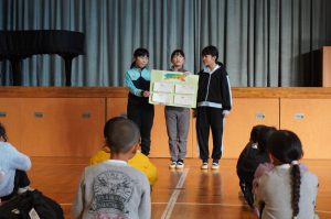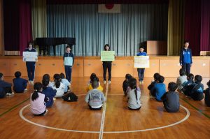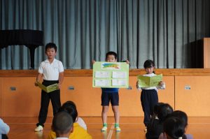12月5日、にこにこ委員会が司会をして、ハッピーメッセージの各学年の取組発表と、にこにこ委員会のあいさつや誕生日紹介の取組について紹介する発表を行いました。とくにハッピーメッセージについては、各学年から仲間の頑張りを紹介したり、学級の雰囲気がよくなる言葉使いについて紹介したりとそれぞれ発表しました。心が温かくなる集会ができました。