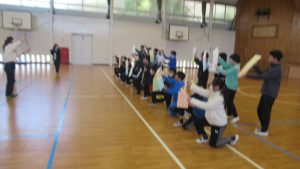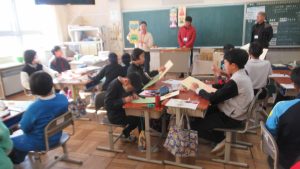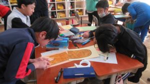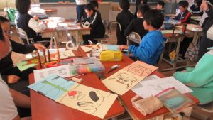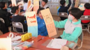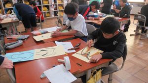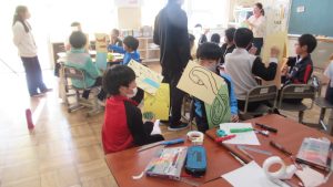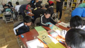 12月10日、人形劇団むすび座の方を迎え、人形劇のワークショップをしました。教室で人形作りをして、体育館で振り付けを習いました。人形づくりは事前にそれぞれが考えた絵をもとにして、それぞれ簡易な人形をつくりました。紙2枚をつなげただけなのですが、動かし方で表情や動きを作ることができます。下の紙を動かして、走るように見せたり、上の紙を傾けて話を聞いているような動きにしたりと学習しました。体育館では、12月18日の人形劇当日に、人形劇に6年生が参加する場面の練習をしました。本番が楽しみです。