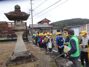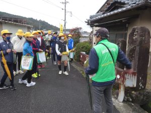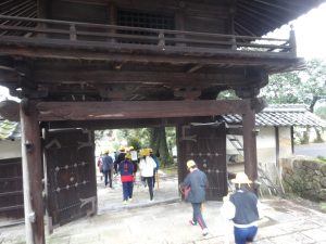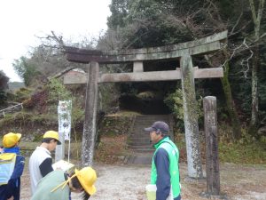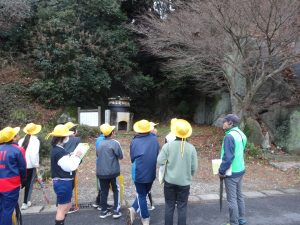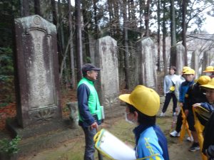12月25日、地域の史跡に詳しい講師の方から、釜戸にある史跡について、一緒に歩きながらお話を聞きました。釜戸小学校を出発して、鉢伏古墳、天猷寺、中切八幡神社、中切辻の道標、馬場氏陣屋跡へ行ってきました。天猷寺では、馬場氏累代の墓石の大きさに驚き、立派な花の木門を見てきました。花の木門から先日行った修学旅行の法隆寺と同じつくりを見つけることもできました。