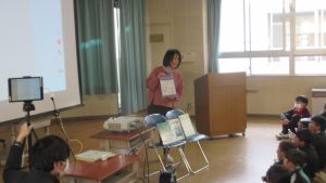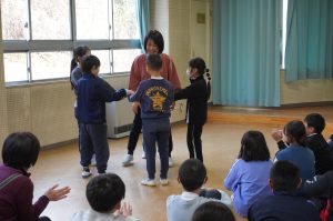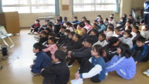 2月12日、朝の活動は、全校読み聞かせでした。先生が順番に本を紹介してきた活動も今年度最後の回になりました。今回は、体育や図工、音楽などに関わる本の紹介ということで、「あそびずかん」や「まるまるまるの本」を読みました。「あそびずかん」の中には、「なべなべそこぬけ」が紹介されていました。2年生の音楽にも出てくるので、2年生も参加して「なべなべそこぬけ」を実際にやり、みんなで笑いながら紹介を聞くことができました。