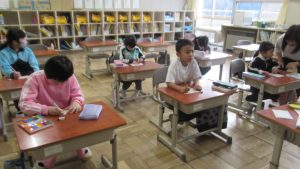 メッセージを書き始めました。5年生が各教室で書き方などを説明したり、教えたりしながら準備を進めました。