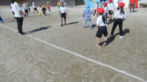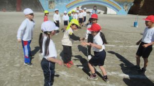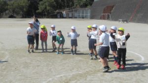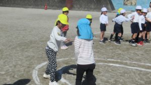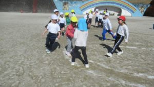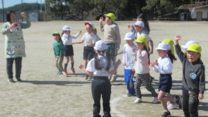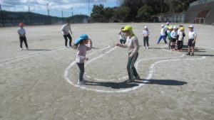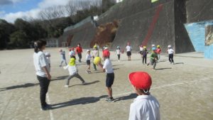 3月4日、こども園の年長さんが歩いて小学校へやってきました。休み時間は思い思いに遊び、その後の3時間目に1,2年生とグラウンドで遊びました。2年生が進行役をして、チームに分かれてコースを進み、ジャンケンして勝ち進む遊びと、ドッジボールを楽しみました。年長さんもあと少しで1年生です。